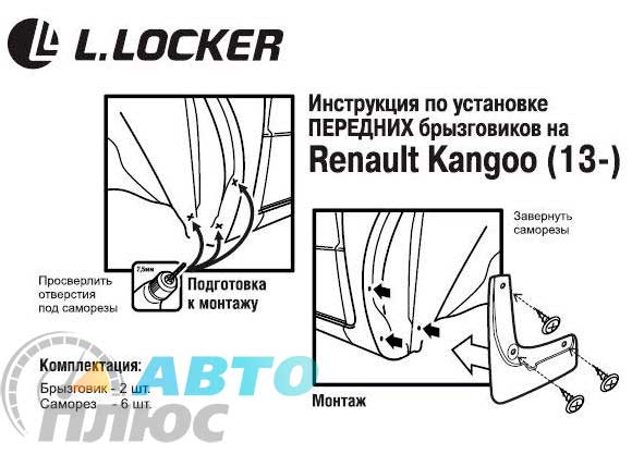 Форма модельных брызговиков Л.Локер соответствует конфигурации переднего крыла автомобиля Renault Kangoo 2 2013- в месте его установки, с учетом штатного и дополнительного крепежа.