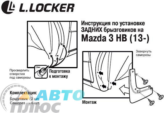 Форма модельных брызговиков Л.Локер соответствует конфигурации заднего бампера автомобиля Mazda 3 2014- Hatchback в месте его установки, с учетом штатного и дополнительного крепежа.