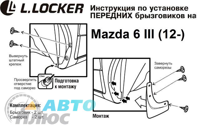 Форма модельных брызговиков Л.Локер соответствует конфигурации переднего крыла автомобиля Mazda 6 2013- в месте его установки, с учетом штатного и дополнительного крепежа.