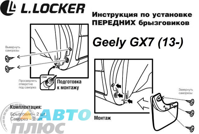 Форма модельных брызговиков Л.Локер соответствует конфигурации переднего крыла автомобиля Geely Emgrand X7 2013- в месте его установки, с учетом штатного и дополнительного крепежа.