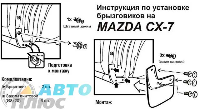 Форма модельных брызговиков Л.Локер соответствует конфигурации переднего крыла автомобиля Mazda CX-7 2006- в месте его установки, с учетом штатного и дополнительного крепежа.
